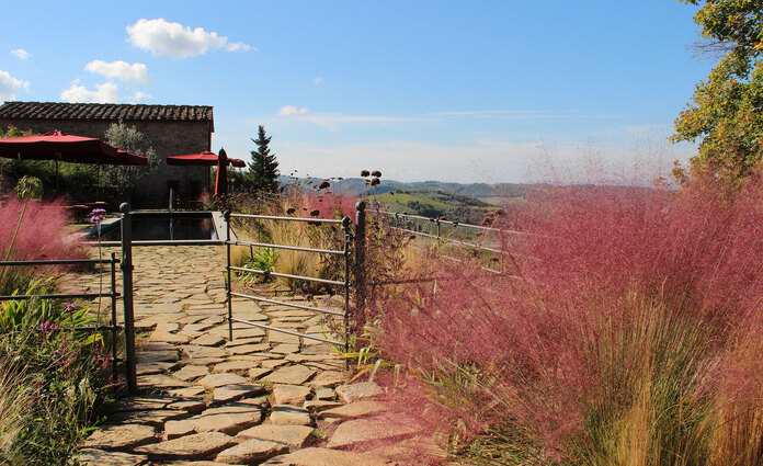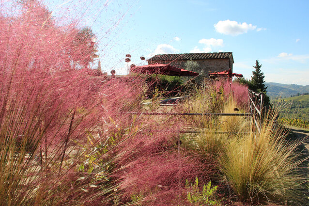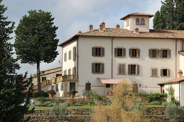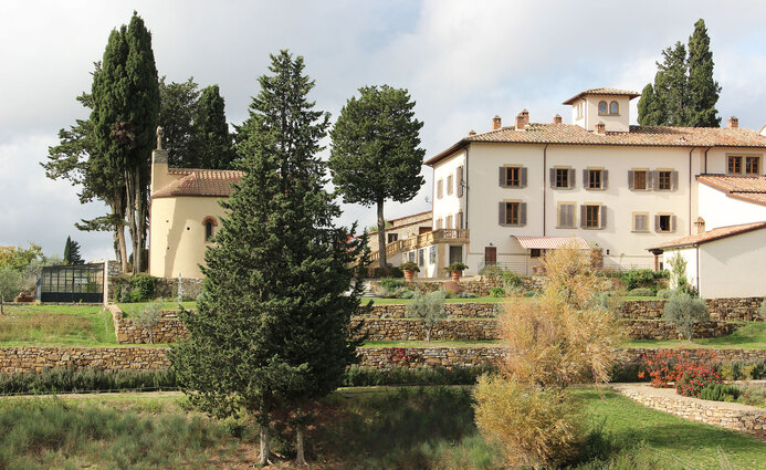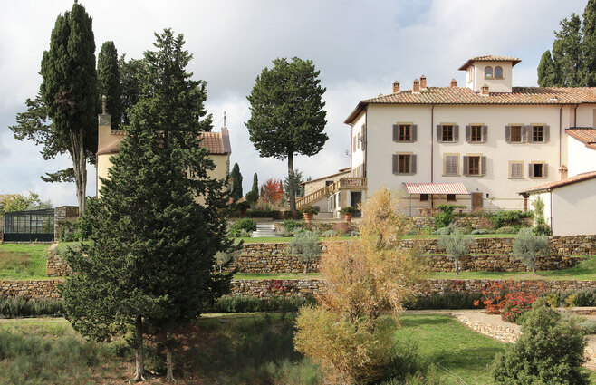 The avenue of olive trees leading to the entrance, the colorful and fragrant lemon garden and the slopes of shrubs and flowers positioned as if to frame small glimpses of the vineyards and the Tuscan hills create a link between the estate and the surrounding landscape
